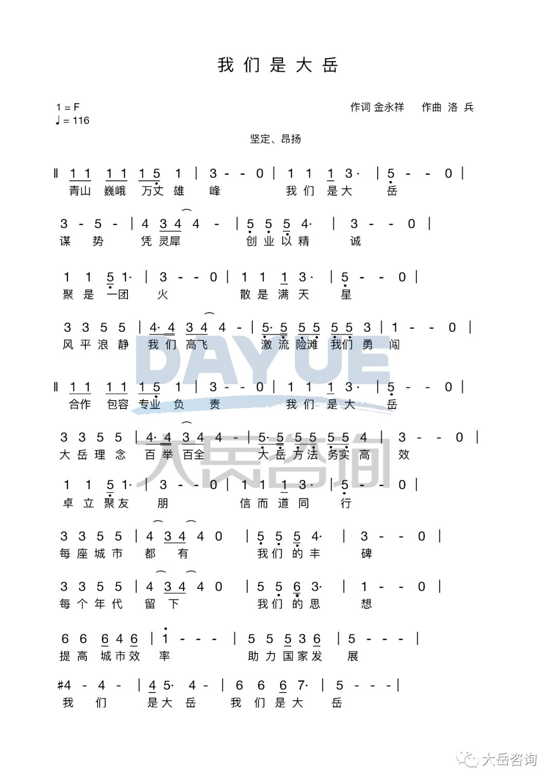 This song is a musical expression of the mission, vision and values of Dayue Consulting, as well as an artistic representation of the company's 22 years of development and achievements, and a warm eulogy of Dayue people's beliefs and ideals. "Towering mountains, and magnificent peaks are likened to us, Dayue people. We use our ingenuity to gather momentum, and build our business with sincerity. We gather together with passionate, and part like dotted stars in the sky. We soar high in calm weather, and brave the rapids and shoals..."